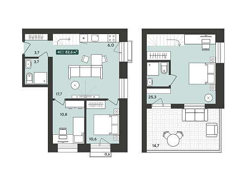 Эти варианты отличает лёгкость зонирования квартиры на общую и приватные зоны. Наверху вы сможете расположить спальни, комнаты отдыха, а внизу — рабочий кабинет, прихожую, гостиную и кухню. Наконец-то для каждого члена семьи будет своё место.