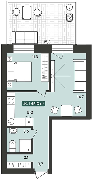 Максимум естественного света и ощущение будто вы живете в собственном загородном доме – вот, что ждет вас в такой просторной планировке.
