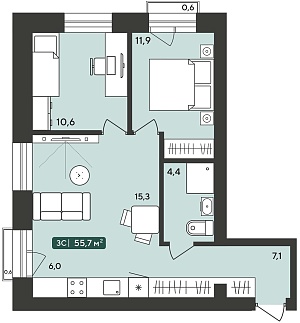 3К студия 55.7 м²