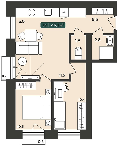 3К студия 49.1 м²