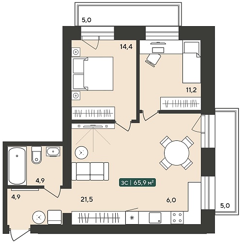 3-комнатная, 65.9 м2